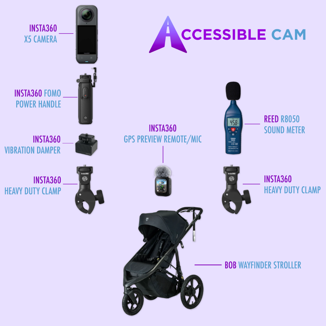 Accessible Cam, led by Cameron "Cam" Jenkins (UE 2029), uses a specially outfitted jogging stroller to capture the reality of the city's sidewalks. The stroller is mounted with 360-degree cameras to help visualize a complete view of the path and surroundings, and a high-definition microphone to record ambient noise. A sound level meter documents noise disturbances while GPS tracks the route and obstacles encountered.